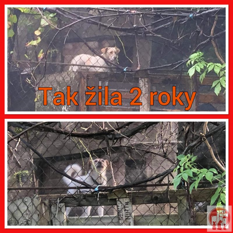 Na začiatku mesiaca október sme dostali do daru supermarketové krmivo Fresh,ktoré naše psíky nejedia a tak sme sa rozhodli to darovať ľuďom čo kŕmia svoje labky takým krmivom.Chodili sme po sociálne slabších rodinách a rozdávali sme darované granulky. V jeden deň sme započuli beznádejný štekot a kňučanie.Bolo to na opustenej chatke a to na najvyššom kopci kde sme ju nevideli iba počuli.Tak sme sa začali informovať koho je to psík.Keďže Nás už poznali tak Nám začali rozprávať.Zistili sme,že žije 2 roky na reťazi v dĺžke 1,5 m a chodia ju tam kŕmiť len sporadicky.Majiteľ jej zomrel toho roku v lete.Dopátrali sme sa na kontakt a výsledok je sloboda.Čo poviete bol to osud,štastie či náhoda?