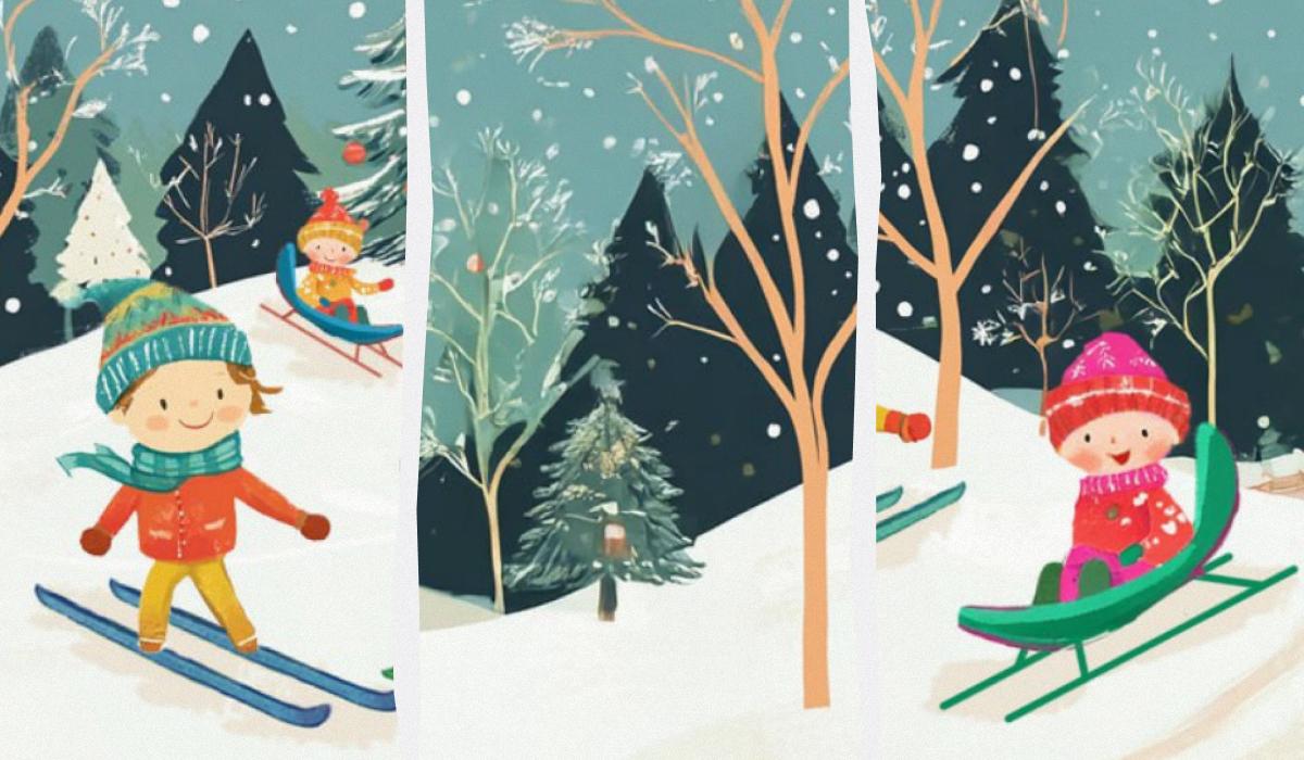 Pred vami je partia šťastných detí, ktoré si v lese užívajú sneh a pravé zimné počasie. Tie najmenšie sa sánkujú a ich starší kamaráti lyžujú.