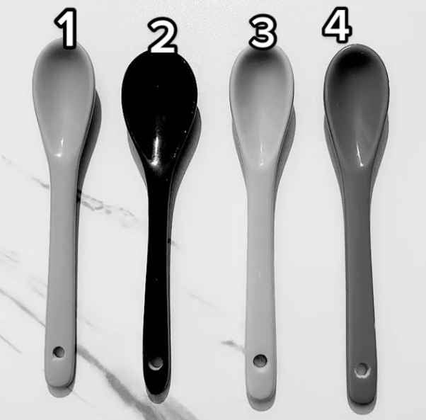 Na obrázku vidíme štyri lyžice, ktoré majú nepochybne rôzne farby. Z obrázka však bola odstránená sýtosť, čo sťažuje okamžité pochopenie, akú farbu má každý z týchto jednotlivých predmetov.