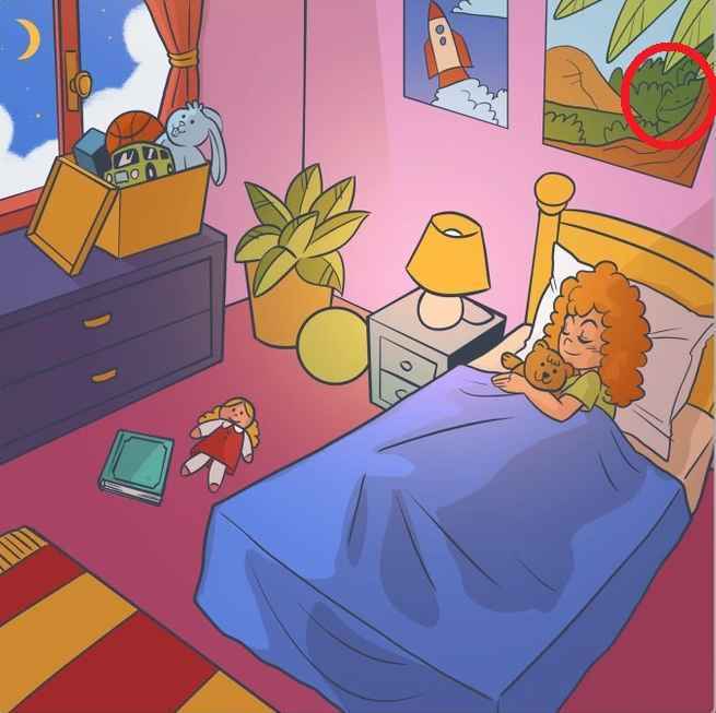Na obrázku je dievča, ktoré spí vo svojej spálni. Objíma plyšového medvedíka, napravo od nej je bábika, zošit a v rohu na skrini je škatuľa s ďalšími hračkami. Vašou úlohou je nájsť, kde je žabka. Skrýva sa celkom blízko.