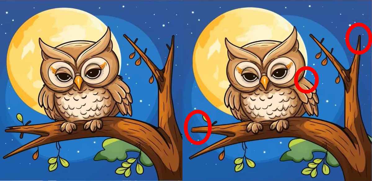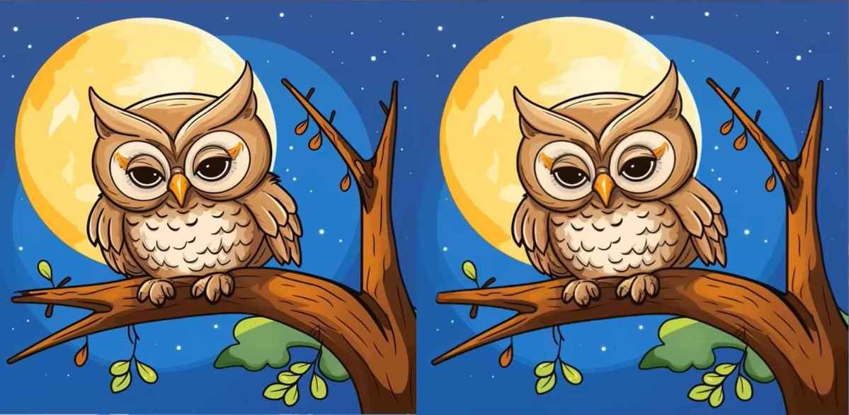 Pred sebou máte dva obrázky sovy na strome. Na prvý pohľad sa zdá, že sú úplne rovnaké, ale nie je to tak – sú medzi nimi skryté tri jemné rozdiely.