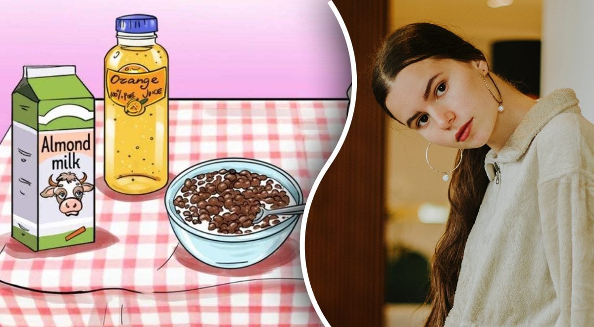 Na obrázku vidíme misku cereálií zaliatych mliekom, lákavú čokoládovú sušienku, fľašu osviežujúceho pomarančového džúsu a kartón zdravého mandľového mlieka. Na prvý pohľad nie je na obrázku žiadna chyba. Ale to je presne ten prípad, keď by ste nemali dôverovať prvému dojmu.